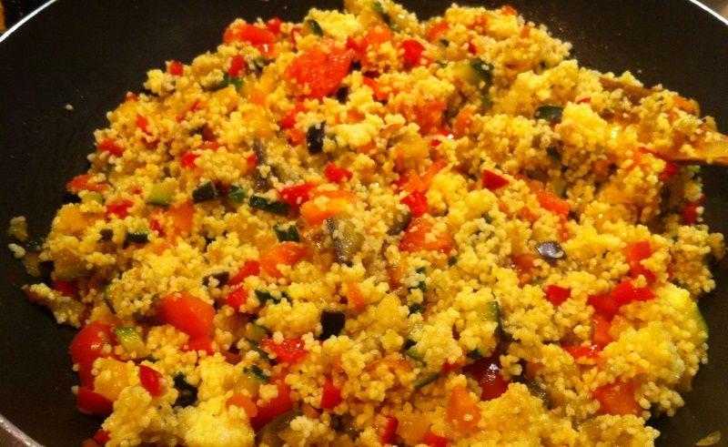 Mod de Preparare: Taiati legumele si puiul in cubulete. Într-o tigaie, puneti uleiul si caliti rapid puiul, morcovul, dovlecelul și ardeiul. Condimentati cu sare, piper și curcuma (dupa gust). Se amesteca bine. Puneti putina apa si acoperiti (lasati capacul pe jumatate deschis). Gatiti aproximativ 10 minute. Asigurati-va ca totul este gatit. Pregatiti cuscusul dupa metoda de preparare: 50 gr de cuscus la 50 ml de supa fierbinte.