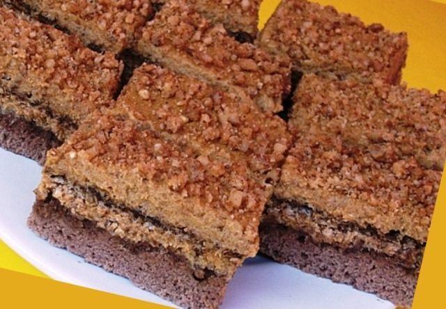Pentru crema: Mixati restul ingredientelor pana cand amestecul se omogenizeaza. Intindeti pe unul din blaturi, apoi plasati-l pe celalalt deasupra. Folositi restul de crema ca topping. Presarati nucile ramase pe deasupra. Faramitati caramelul obtinut si presarati-l peste nuci.