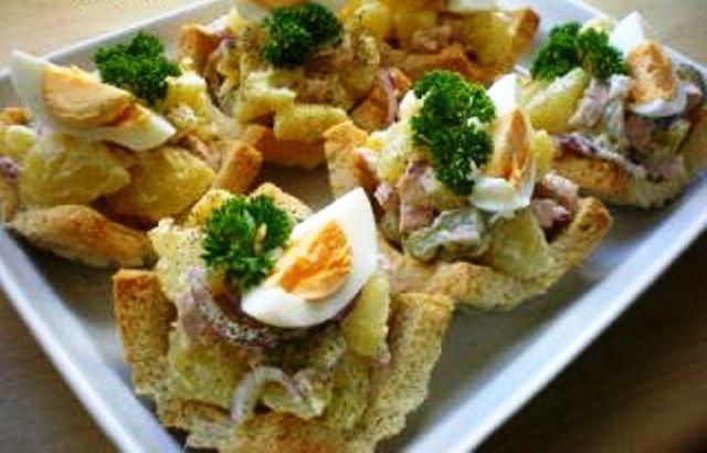 Mod de Preparare: Am taiat coaja feliilor de paine, apoi le-am stropit cu putina apa si am aranjat fiecare felie intr-o forma de savarina, apoi am bagat in cuptor la foc potrivit pana au prins o culoare frumoasa. Le scoatem si le lasam sa se raceasca in forme. Curatam cartofii, ii spalam si ii taiem cubulete, apoi ii fierbem in apa cu un praf de sare. Dupa ce cartofii s-au fiert, ii lasam la racit. Taiem ceapa solzisori si o amestecam cu castravetii taiati feliute subtiri, adaugam si cartofii impreuna cu salamul taiat cubulete mici. Condimentam si amestecam totul cu maioneza. Umplem cosuletele cu salata si ornam cu o felie de ou fiert si patrunjel verde. Sunt delicioase!