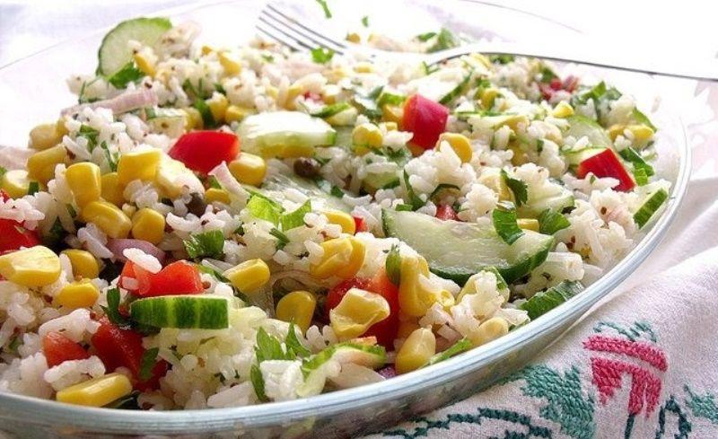 Mod de Preparare: Gatiti orezul timp de 12 minute in apa clocotita sarata, apoi lasati-l sa se raceasca. Adaugati ceapa si rosiile taiate in cubulete. Adaugati castravetii murati tocati, porumbul si tonul faramitat.