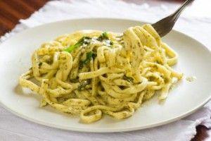 Se prepara un sos din jumatate din cantitatea de parmezan, smantana, nucsoara, coaja de lamaie. Se fierb pastele conform indicatiilor de pe ambalaj. Se scot pastele fierte si se trec intr-o tigaie in care avem untul topit; mai adaugam un polonic din apa fierbinte si sosul format; condimentam dupa gust cu un praf de piper alb. Se servesc fierbinti cu parmezan ras.