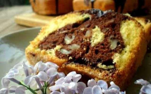 Mod de Preparare: Se separa albusul de galbenus de la cele 5 oua. Galbenusurile si 200 gr din cantitatea de zahar se freaca pana se albesc. Treptat se pun cele 5 linguri de ulei si apoi cele 3 linguri de apa fiarta (una cate una). Albusurile cu un praf de sare si 100 gr din cantitatea de zahar, se bat spuma. Peste galbenusuri se adauga albusurile batute spuma. Nu amestecati! Apoi faina cernuta, esenta de vanilie si coaja de lamaie netratata. Se incorporeaza acum toate ingredientele, amestecand usor de jos in sus, cu o spatula. Din compozitia rezultata se ia 1/3 si se amesteca cu 2 linguri cu varf de cacao. Tava de copt se tapeteaza cu hartie de copt si se toarna compozitia galbena, distribuind uniform. Am presarat acum jumatate din miezul de nuca. Apoi se toarna si compozitia cu cacao si cu ajutorul unei furculite si amesteca usor de jos in sus, astfel incat sa incorporam compozitia cu cacao in cea cu galbena. Nu amestecati! deasupra punem restul de miez de nuca si petite sau banuti de ciocolata. Se incalzeste cuptorul la 170° si se introduce checul nostru pentru 40-45 minute. (aici este varianta doar cu nuca deasupra).