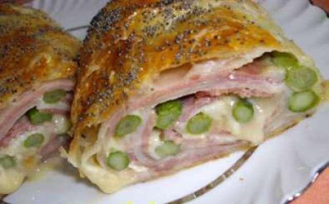 Mod de Preparare: Fierbem sparanghelul "al dente" intr-un vas incapator, in apa sarata si-l lasam la racit.Derulam aluatul de foetaj si punem 4 felii de prosciutto crudo (cred ca merge si cu sunca presata). Feliutele mele au fost taiate acasa, deci sint cam bucatele, de aia nu se poate vedea ca ar fi 4 felii. Acoperim cu felii de brinza (putem pune si brinzica moale din cea feliata). Punem apoi sparanghelul dupa care, punem din nou brinza si terminam cu prosciutto crudo. rulam aluatul paralel cu sensul in care am asezat sparanghelul, inchidem bine la capete si transferam rulada intr-o tava pentru cuptor pe hirtie de copt. Ungem cu ou zbatut si presaram deasupra mac. Bagam in cuptorul preincalzit la 180° pentru circa 35-40 minute sau pina se rumeneste bine rulada. Scoatem din cuptor, lasam sa se raceasca, taiem feliute si servim alaturi de o bericica.