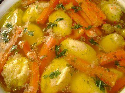 Mod de preparare: Se fierbe bine carnea, dupa care se scoate din oala, iar in zeama ramasa se adauga legumele taiate felii (nu foarte mici). Cand legumele au fiert, am condimentat supa si am preparat si galustele. Ele trebuie puse imediat in supa fierbinte, altfel se intaresc.