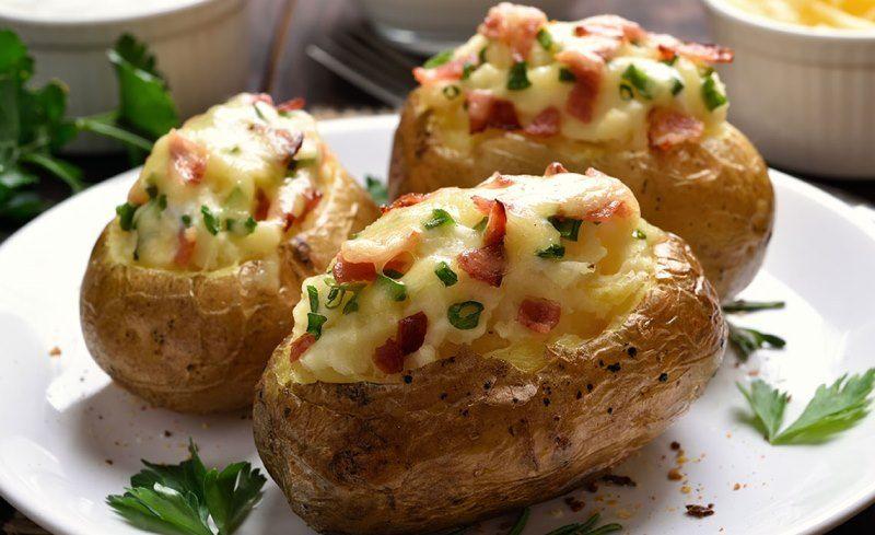 Mod de Preparare: Spalati bine cartofii. Stergeti-i si infasurati-i in folie de aluminiu si puneti-i in cuptorul preincalzit la 180° C timp de aproximativ 1 ora. Interiorul trebuie sa se coaca. Intre timp, se caleste ceapa cu un pic de ulei de masline pana devine translucida. Se adauga baconul. Puneti deoparte cand este gata. Taiti cartofii in jumatate. Scobiti miezul cartofilor si adaugati-l la amestecul anterior. Adaugati smantana, cascvalul si ceapa verde tocata si amestecati. Condimentati dupa gust. Umpleti jumatatile de cartofi cu umplutura si rumeniti la cuptor pentru aproximativ 15 minute la 180° C. E gata! Decorati cu ceapa verde tocata.
