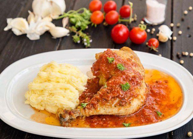Mod de Preparare: In prima faza se spala puiul si se taie bucati apoi se presara cu sare si piper. Se aseaza bucatile de pui intr-o tava, se presara cu ulei si se pune o cana de apa apoi se acopera cu folie de aluminiu si se introduce in cuptor-ul incins in prealabil. Intre timp se dau rosiile pe razatoarea mare, se toaca verdeturile si se piseaza usturoi-ul apoi se amesteca totul pana cand veti obtine un sos omogen. Dupa aproximativ 30 de minute se ia folia de pe tava si se toarna sosul de rosii realizat anterior. Se introduce tava iarasi la cuptor pentru alte 30 de minute. Din cand in cand se presara peste carne sos-ul din tava. Puiul astfel gatit se serveste cu o garnitura de cartofi sau orez si eventual muraturi...pofta buna!