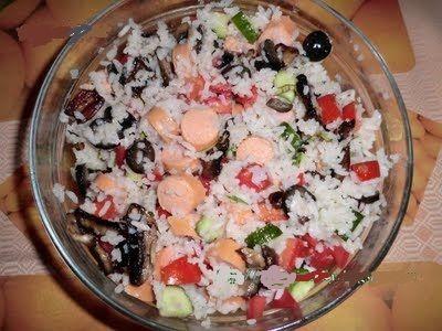 Mod de preparare: Cartofii si ciupercile se taie felii. Crenvustii si castravetele se taie rondele, ceapa, ardeiul si mararul se toaca marunt si se pun toate intr-un castron. Se amesteca cu smantana si cu otetul de mere. Se garniseste salata cu cornete din salam cu sunca sau parizer umplute cu ouale taiate marunt si amestecate in prealabil cu o lingura de maioneza si cu foile de salata verde taiate fasii.