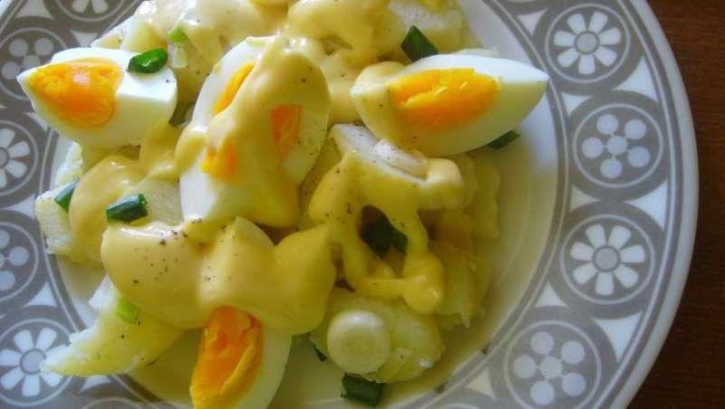 Mod de Preparare: Se taie cartofii fierti rondele, ceapa la fel, ouale se taie in 4, se condimenteaza dupa gust, turnam cca 1-2 lg ulei de masline si sosul maioneza deasupra (sosul din: 1 galbenus de ou, 1 lg mustar, ulei, smantana)
