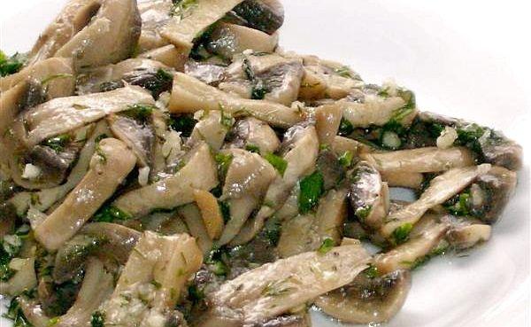 Mod de Preparare: Ciupercile le spalam bine in apa rece si le fierbem 15 minute in apa cu sare, foi de dafin, otetul si piperul boabe. Le strecuram si le asezam intr-o salatiera. Le feliem in functie de marimea lor. Separat zdrobim usturoiul, il amestecam cu cateva linguri de zeama in care au fiert ciupercile, ulei dupa dorinta, si apoi turnam solutia obtinuta peste ciupercile din salatiera. Amestecam usor ca sa se asezoneze si le servim garnisite cu patrunjel tocat.