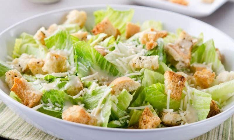 Asamblare: Asezati frunzele de salata rupte pe un platou, adaugati pieptul de pui taiat cubulete, cascavalul la fel taiat, crutoanele si sos de iaurt din belsug.