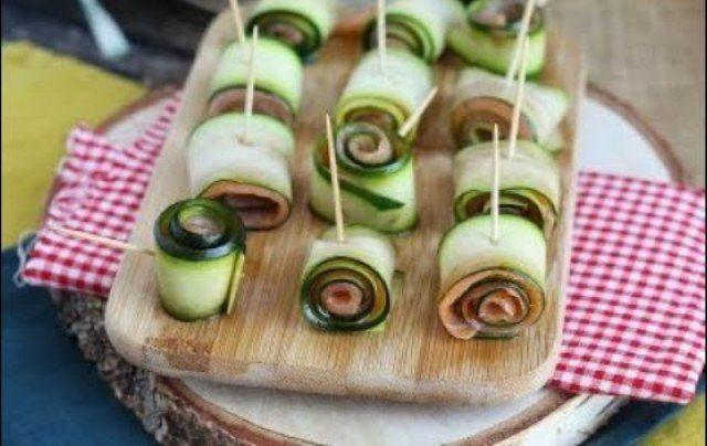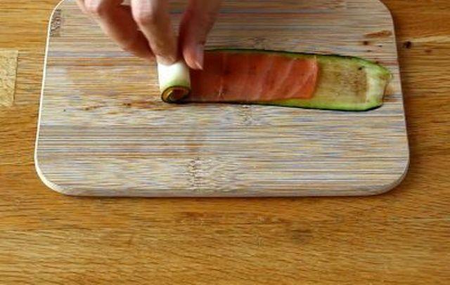 Mod de Preparare: Spalati dovleceii. Faceti felii de dovlecei cu ajutorul unui curatator de legume.Taiati feliile de somon astfel incat sa aiba aceeasi latime cu feliile de dovlecei. Amestecati uleiul de masline cu otetul balsamic, sarea si piperul. Periati feliile de dovlecel cu aceasta vinegreta. Puneti feliile de somon deasupra. Rulati fasiile, apoi fixati-le cu ajutorul unei scobitori. Pofta buna!