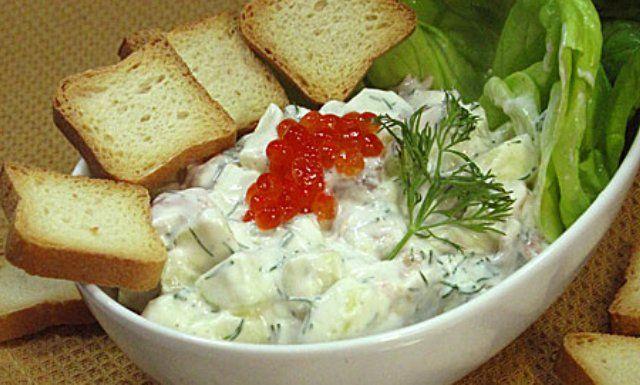 Mod de Preparare: Se amesteca intr-un castron iaurtul cu mustar. Se asezoneaza cu piper alb. Se adauga in castron merele, somonul si mararul tocat si se amesteca. Se potriveste de sare si piper, daca este nevoie. Se captusesc cu foi de salata 4 boluri. Se imparte salata intre boluri. Se orneaza cu icre de somon si se serveste cu toasturi. Este buna si imediat, dar este mai buna dupa ce este lasata in frigider macar jumatate de ora, sa se raceasca si sa se imprieteneasca aromele.