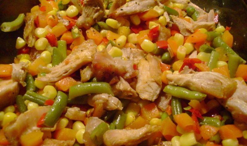 Mod de Preparare: Pieptul de pui se spală, se zvântă și se taie bucățele mici. Tocăm mărunt atât ceapa, cât și usturoiul și se călesc în ulei încins pentru 1-2 minute la foc mare. Adăugăm bucățile de pui și amestecăm. Se prăjesc bine pe toate părțile, apoi adăugăm praful de chimen și chilli și amestecăm. Adăugăm legumele congelate și acoperim cu un capac. Lăsăm la foc potrivit pentru 10 minute, amestecând din când în când, ușor pentru a nu se destrăma carnea. Când legumele sunt făcute, adăugăm bulionul stins cu apă și condimentăm cu sare. Mai lăsăm 2-3 minute și stingem focul. Servim fierbinte și ornăm cu ardei iute tăiat feliuțe.