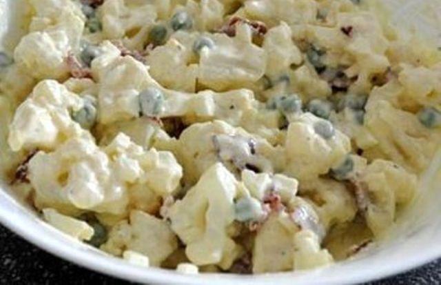 Intre timp, se piseaza usturoiul si se amesteca cu maioneza (in loc de usturoi puteti folosi o ceapa taiata marunt). Se marunteste conopida, se amesteca cu sosul de maioneza si usturoi si se aseaza in salatiera pe un pat de salata verde. Se garniseste cu marar, patrunjel sau numai cu masline.