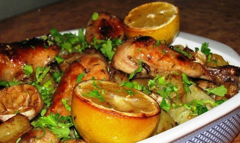 Mod de Preparare: Intr-un castron amestecati uleiul cu mustarul, otetul, cimbrul, rozmarinul, usturoiul pisat, sarea, piperul. Taiati o lamaie in doua si stoarcetii sucul, apoi adaugati-l in castronul cu sos si mirodenii. Asezati pulpele de pui intr-o cratita mare si turnati sosul obtinut. Taiati si cealalta lamaie in doua jumatati si adaugati-le in cratita unde se afla pulpele de pui si sosul pentru marinat. Lasati-le sa stea la marinat in frigider cateva ore (10-12). Incingeti cuptorul la 200 grade. Turnati sosul marinat intr-o tava mare de cuptor, adaugat cartofii noi taiati pe jumatate, iar deasupra aranjati pulpele de pui avand grija sa puneti inclusiv jumatatile de lamaie, si orice alte urme de cimbru, rozmarin, usturoi. Dati pulpele de pui cu cartofi si ierburi in cuptorul incins timp de 50-60 minute sau pana cand cartofii sunt copti, iar pulpele sunt rumenite si patrunse. Cand serviti pulpele de pui cu cartofi la cuptor si ierburi presarati deasupra patrunjelul tocat.