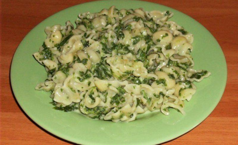 Mod de Preparare: Într-o oală punem apă rece la fiert. Adăugăm 1/2 linguriță sare și punem capac să fiarbă apa mai repede. Între timp curățăm ceapa și usturoiul și se toacă mărunt. Topim untul într-o tigaie și călim ceapa cu usturoiul. Adăugăm spanacul decongelat - spanacul proaspăt ar fi și mai gustos și mai sănătos :). Gătim la foc mic pentru max. 5 minute. Condimentăm cu nucșoară, busuioc, sare și piper. Când apa începe să fiarbă, adăugăm pastele și se fierb al dente, conform instrucțiunilor de pe ambalaj. Când sunt gata se strecoară și se amestecă cu spanacul. Se pun într-o formă termorezistentă unsă cu unt. Se toarnă smântâna peste ele, repartizânduse uniform. Presărăm cașcavalul ras și dăm la cuptor pentru 25-30 minute.