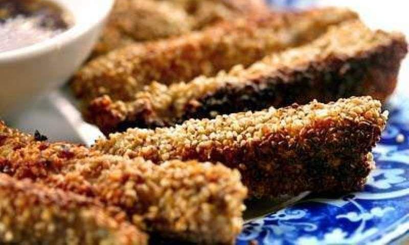 Mod de Preparare: Se clatesc cu apa fileurile de peste. Se pun la uscat pe prosoape de hartie si se taie in bucati inguste. Se pun intr-un castron. Marineaza pestele cu ceapa tocata, piperul si sarea. Se lasa timp de 15 minute. Bateti ouale usor, apoi amestecati cu amidonul de porumb, faina si putina sare pentru a face un aluat moale. Se incalzeste uleiul pana devine fierbinte. Scufundati bucatile de peste in aluat, apoi rostogoliti in seminte de susan. Se pun in uleiul fierbinte si se prajesc pana devin aurii, pe ambele parti sau daca va plac mai crocante pana devin putin maronii. Se scurg pe un prosop de bucatarie.