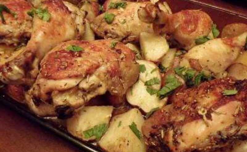 Mod de Preparare: Intr-un castron amestecati uleiul cu mustarul, otetul, cimbrul, rozmarinul, usturoiul pisat, sarea, piperul. Taiati o lamaie in doua si stoarcetii sucul, apoi adaugati-l in castronul cu sos si mirodenii. Asezati pulpele de pui intr-o cratita mare si turnati sosul obtinut. Taiati si cealalta lamaie in doua jumatati si adaugati-le in cratita unde se afla pulpele de pui si sosul pentru marinat. Lasati-le sa stea la marinat in frigider cateva ore (10-12). Incingeti cuptorul la 200 grade. Turnati sosul marinat intr-o tava mare de cuptor, adaugat cartofii noi taiati pe jumatate, iar deasupra aranjati pulpele de pui avand grija sa puneti inclusiv jumatatile de lamaie, si orice alte urme de cimbru, rozmarin, usturoi. Dati pulpele de pui cu cartofi si ierburi in cuptorul incins timp de 50-60 minute sau pana cand cartofii sunt copti, iar pulpele sunt rumenite si patrunse. Cand serviti pulpele de pui cu cartofi la cuptor si ierburi presarati deasupra patrunjelul tocat.