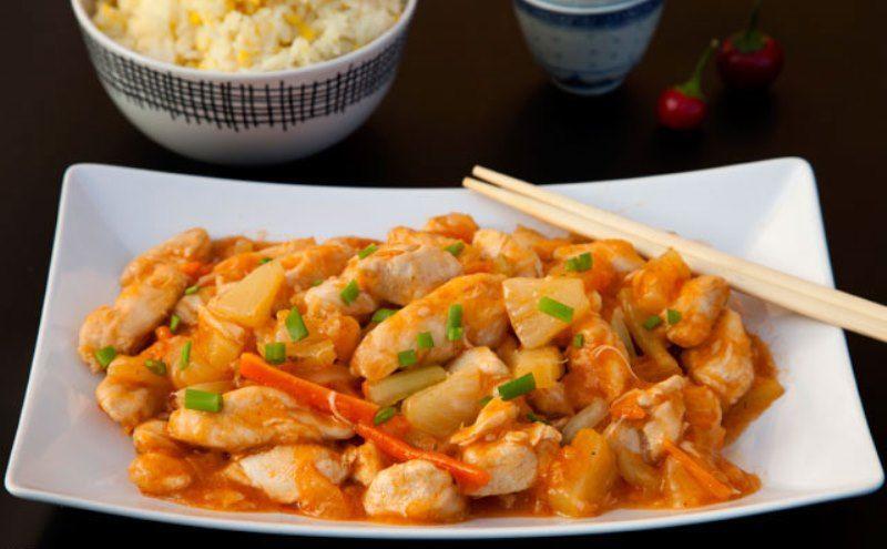Mod de Preparare: Intre timp puteti sa va curatati legumele, sa tocati ceapa si usturoiul marunt si sa taiati morcovii si telina bastonase fine. Dupa ce a trecut jumatatea de ora in care s-a marinat carnea, puneti o lingura de amidon peste pui, amestecati si apoi prajiti bucatile in ulei. Cand acesta este gata se scoate si se tine la cald. Incingeti wok-ul, adaugati ulei si puneti toate legumele la prajit impreuna cu ghimbirul pana acestea se inmoaie putin, cam 3-5 minute. Se adauga conserva de ananas cu zeama cu tot si 3 ling de sos de soia si se lasa sa fiarba putin. Cand s-a evaporat apa se pune si puiul si daca se doreste ca sosul sa fie mai gros se mai adauga o lingurita de amidon si se amesteca.