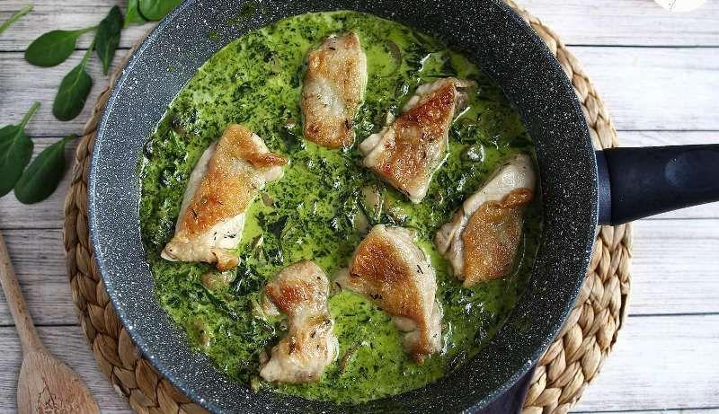 Mod de Preparare: Tăiați bucățile de pulpele de pui în jumătate. Topiți untul cu uleiul de măsline într-o tigaie încinsă și prăjiți puiul timp de 5 minute pe fiecare parte. Adăugați sare, piper, cimbru și amestecați. Turnați apa în tigaie și acoperiți. Lăsați să se gătească aproximativ 45 de minute. Se topesc untul și uleiul intr-o tigaie, se adauga ciupercile tăiate fâsii și se rumenesc 5-10 minute. Se adaugă ceapa tocată și spanacul și mai călește 5 până la 10 minute. Se condimentează cu sare și piper. Se toarnă smântâna vegetală în tigaie și se lăsă sosul să se reducă aproximativ 10 minute. Puneți bucățile de pui gătite în sos și gata!