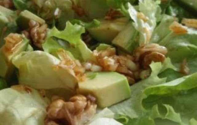 Mod de Preparare: Se prajeste baconul, fara ulei, pana ce se face crocant. Se toaca marunt. Se pune apoi intr-un castron, impreuna cu telina si ceapa verde. Se taie avocado-ul in jumatate si apoi, folosind un cutit foarte ascutit, se feliaza subtire. Se decojeste fiecare feliuta si se stropeste generos cu suc de limeta. Se transfera apoi in castron, alaturi de telina si bacon. Se amesteca intr-un castronel iaurtul cu ulei de masline si boia. Se transfera mixtura in castronul cu salata si se amesteca. Se presara salata cu nuca tocata si se serveste.