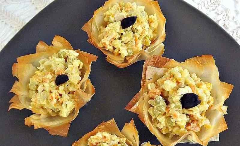 Mod de Preparare: Metoda este la fel ca la Mini-Tarte cu crema de branza si salam, doar ca acum din foile de placinta, am taiat cercuri, pe care le-am copt in forme mici de tarte. Sunt practice, pentru ca se pot face inainte cu 1-2 zile si se pot umple doar cand avem nevoie.