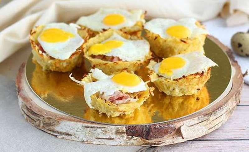 Mod de Preparare: Curatati cartofii si dati-i pe razatoare. Puneti-i intr-un prosop si stoarceti cat mai bine pentru a scoate apa din ei. Dupa ce i-ati stors puneti-i intr-un vas, apoi adaugati cele 2 oua, sare, piper si amestecati bine. Puneti 1 lingura cu varf din amestecul de cartofi in fiecare forma de briosa, unsa in prelabil. Apoi, cu degetele, presati cartofii pana la margini pentru a forma cuiburile. Puneti in cuptor si coaceti timp de 12 minute la 180° C. Taiati sunca presata in bucati mici si caliti intr-o tigaie fierbinte. De asemenea, gatiti ouale de prepelita in tigaie. Cand cuiburile de cartofi s-au gatit, lasati-le sa se raceasca cateva minute, apoi desfaceti-le usor. Puneti cascaval ras pe fundul fiecarui cuib, apoi cateva bucati de sunca si acoperiti cu un ou de prepelita prajit.