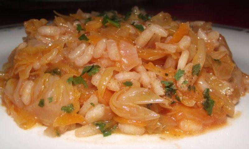 Mod de preparare: Se spală şi se curăţă varză de frunzele exterioare. Se îndepărtează cotorul şi se taie frunzele în fâşii de 2 cm. Se pun la fiert împreună varza, orezul, ţelina, ceapa, usturoiul, foile de dafin, sarea, uleiul şi se completează cu apă. Cratiţa se acoperă cu un capac. Se prepară un amestec de roşii sau bulion cu oregano, chimen, vin, scorţişoară şi piper care se adaugă peste varză. Se amestecă bine şi se lasă pe foc până când scade sosul. Se poate presăra puțin pătrunjel verde deasupra. ATENŢIE să nu se prindă mâncarea! Poftă bună!