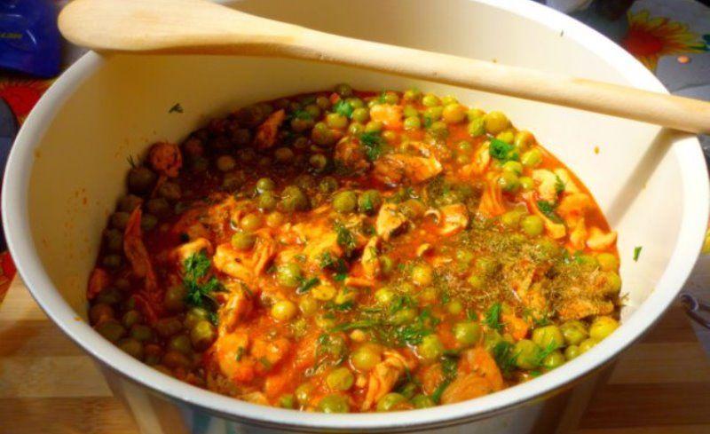 Mod de Preparare: Într-o cratiţă punem puţin ulei să se încingă, după care adaugăm toate legumele să se călească, dar fără să se ardă. Dupa vreo 5 min adaugăm şi mazărea şi completăm cu apă sau supă de carne şi lăsam sa fiarba la foc mic. Dacă mazărea cumpărată de voi este una tare este bine să o fierbeţi înainte şi apoi o adăugaţi peste legume. Între timp, într-o tigăiţă cu ulei încins, prajesc pieptul de pui taiat in bucati mai mici si condimentat bine. Când mazărea şi legumele s-au fiert, condimentam cu sare, piper si se adauga si rosiile. Dupa ce a fiert bine si a mai scazut adăugăm şi carnea prajita usor în mâncărica noastră. Lasăm mâncărica pe foc până când mai scade sosul. La final presăram marar.