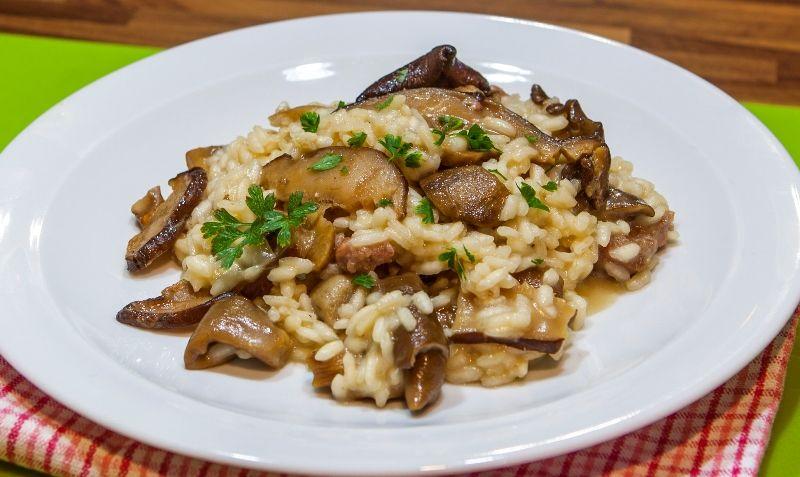Mod de Preparare: Din manunchiul de pleurotus se desprind paraiile, mai mari sau mai mici, se trec printr-un jet de apa si se taie in felii nu foarte subtiri. Atunci cand o servim sa simtim ca si cum ar fi o bucata de carne. Apoi se soteaza intr-o tigaie cu putin ulei de si un cub de unt. Se intoarce totul cu o paleta. Cand totul a inceput sa se inmoaie, se adauga boabele de mazare (congelate) si boabele de porumb fiert. Separat intr-o alta cratita, se distuie in unt si putin ulei ceapa verde taiata oblic, in felii de 5-6 mm si usturoiul. Dupa 1-2 minute usturoiul se scoate si se adauga orezul. Se amesteca bine sa cuprinda toata grasimea si cand acesta devine oarecum translucid, incepem sa adaugam vinul, apoi supa de legume calda. Pe masura ce lichidul se absoarbe, se mai adauga in continuare. Spre final se adauga amestecul de mazarea, porumbul fiert si ciupercile. Se mai lasa vasul acoperit cateva minute. Cand orezul este fiert, ar trebui sa ti se topeasca în gura. La sfârsitul se adauga si lingura de smantana si mararul tocat.