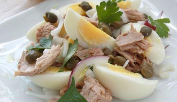Mod de Preparare: Fierbeti ouale intr-o cantitate mare de apa si putina sare, pentru cca. 8-9 minute. Imediat ce s-au fiert le lasati la racit sub jet de apa rece. In felul acesta se vor decoji mai repede. Le decojiti, le taiati in doua, iar fiecare jumatate in feliute. Capperele, daca sunt in sare le lasati la desarat, schimbandu-le apa de vreo doua trei ori. Ceapa o taiati solzijori fini. Daca vi se pare cu miros prea puternic, le puteti tine in apa pentru cateva minute. Tonul il scurgeti bine de sucul in care a fost in conserva.