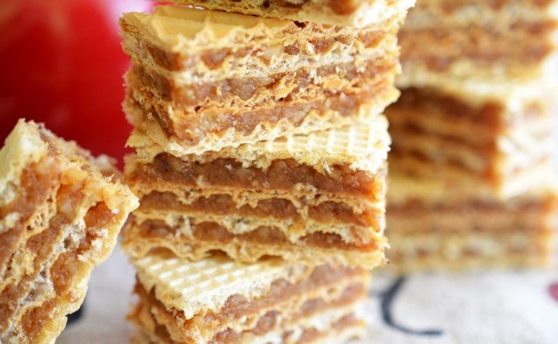 Mod de Preparare: Intr-un castron se freaca untul cu zaharul, apoi se adauga nucile macinate si putina esenta de rom. Se tine pe foc mic amestecandu-se mereu pana ce s-a topit complet zaharul. Crema obtinuta se lasa putin la racit, apoi se pune intre cele (2-3 foi de napolitana). Se aseaza o greutate deasupra ca sa se preseze bine. Se taie patratele sau romburi.