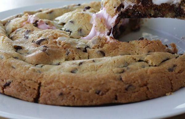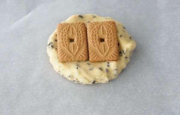Mod de Preparare: Amestecati untul inmuiat cu zaharul brun. Adaugati oul si amestecati. Adaugati faina, praful de copt si zaharul vanilat si amestecati. Adaugati pepitele de ciocolata in amestec. Impartiti aluatul in doua, formati o bila și asezati-o pe o foaie de copt, apasand putin pe ea. Puneti cei 2 biscuiti in mjloc. Apoi aranjati marshmallows peste biscuiti. Luati cealalta jumatate de aluati si acoperiti totul, sigiland bine marginile. Nu aplatizati! Lasati-l ca o minge! Puneti la cuptor pentru 15 - 20 minute la 180°C.
