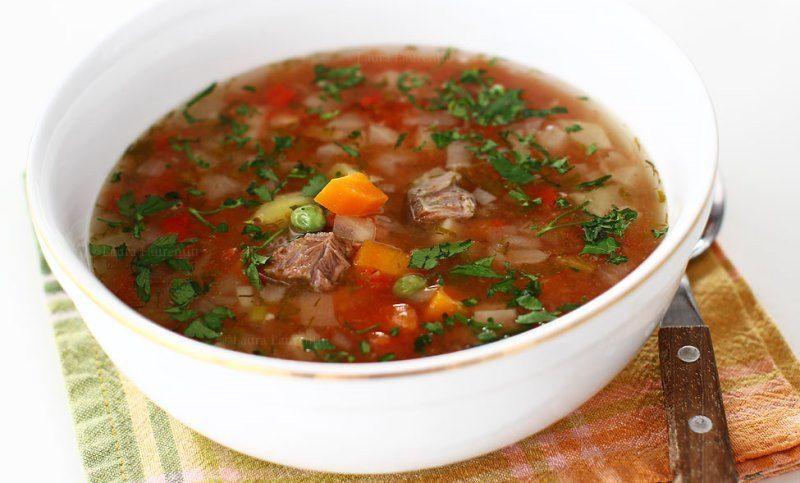 Mod de Preparare: Probabil o sa vi se para o lista foarte lunga dar, in fapt, e ca si cum am face curatenie in frigider! Se poate folosi cu succes o punga de legume congelate, amestec. Este foarte important sa fie cat mai multe legume, acestea dau un gust deosebit. Se folosesc legumele clasice: morcov, telina, pastarnac, ceapa si cartof si in adaos un mix de legume. Ca volum, in final vom obtine circa doua farfurii adanci cu varf de legume tocate! In ceea ce priveste carnea, recomand cu caldura sa se foloseasca gat de vita. Stiu ca suna putin ciudat, dar, credeti-ma pe cuvant, carnea este deosebit de frageda. Din pacate, la macelaria de unde cumpar eu, aduce destul de rar si trebuie sa merg foarte devreme pentru a prinde bucati cu multa carne. De ajuns cu explicatiile, sa trecem la preparare. Carnea se pune la fiert intr-o oala cu apa si se lasa sa fiarba muuuult de tot pana cand se desprinde de pe oase. Se scoate carnea si se lasa la racit. Legumele se toaca marunt, cu exceptia cepei care ramane intreaga. Mazarea ramane si ea ca atare, ar fi chiar ciudat sa o tocam si pe ea. Carnea se desprinde de pe os si se taie cubulete mari, se curata de tendoane si de eventuale bucati de os. Binenteles ca se poate curata si portiona nefiarta, dar mie mi se pare mult mai simplu asa, plus ca la final aspectul e mai uniform. Intr-o oala de 5 litri se pun legumele tocate, ceapa, carnea si se acopera cu zeama de la carne, strecurata bine. Se completeaza cu apa. Se pune la fiert. Dupa ce incepe sa clocoteasca, se adauga bulionul, borsul si sare dupa gust. Se adauga leusteanul tocat, se mai da intr-un clocot si apoi se stinge focul si se adauga verdeata. Se acopera oala cu un capac. Rezultatul este delicios, carnea se topeste in gura. Smantana proaspata si ardeiul iute desavarsesc aceasta ciorbica traditionala.