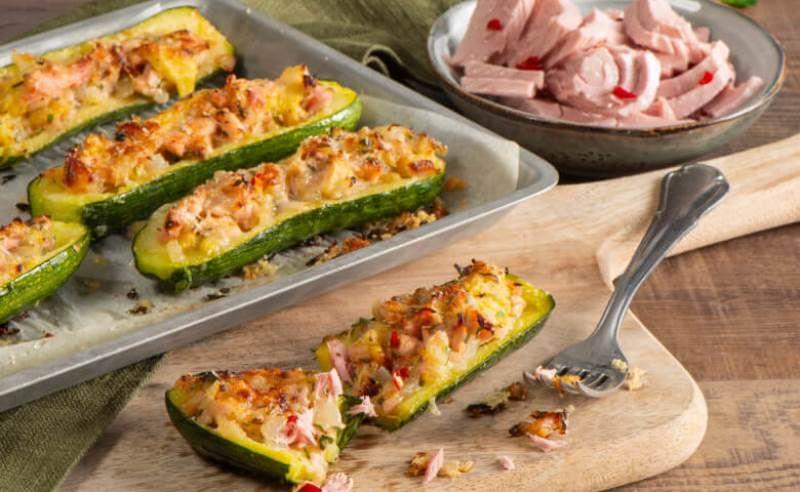 Mod de Preparare: Se spala dovleceii, se taie pe lungime si se curata de miez. Ceapa se caleste in 2-3 linguri de ulei, dupa care se adauga tonul bine scurs si rosiile. Se condimenteaza cu sare, piper si busuioc, poate si putin praf de chili daca va place mai picant. Se fierb la foc mic vreo 5 minute. Se umple fiecare dovlecel si se presara cascaval ras deasupra. Se introduc la cuptor pentru 30 de minute.