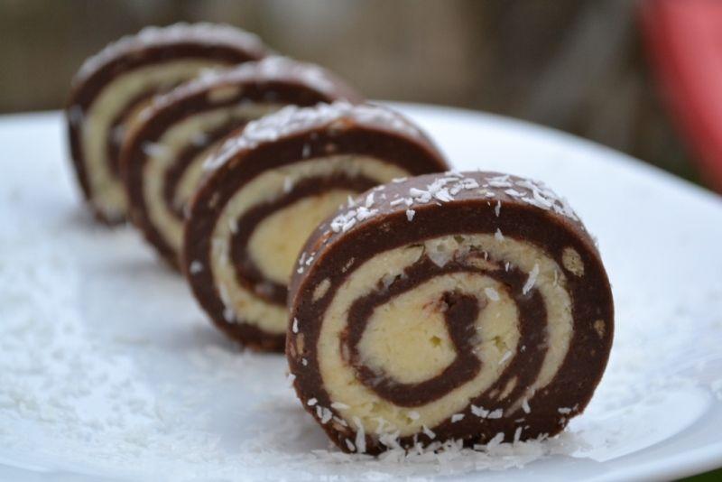 Mod de Preparare: Se sfarama bine biscuitii, apoi se adauga laptele putin cate putin, amestecati bine pana devine compozitia omogena. Frecati untul cu zaharul pudra pana devine ca o spuma, adaugati nuca de cocos si mai amestecati putin. Pe o bucata de folie alimentara se pune compozitia de biscuiti, se intinde bine apoi acopetiti cu o alta folie si intindeti cu facaletul bine. Intindeti apoi crema de cocos peste compozitia de biscuiti, rulati bine si strangeti bine la ambele capete. Se da la rece pentru cateva ore, taiati felii mai groase, de grosimea unui deget.