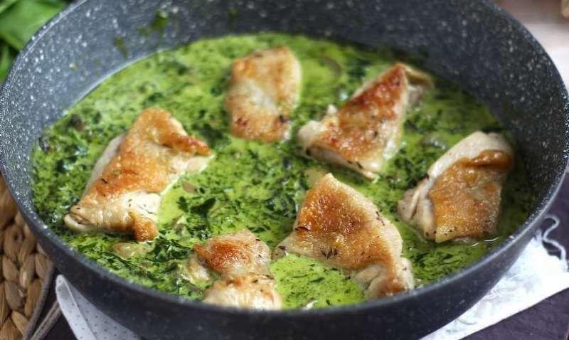 Mod de Preparare: Tăiați pulpele în bucăți potrivite, topiți untul cu uleiul de măsline într-o tigaie încinsă și prăjiți puiul timp de 5 minute pe fiecare parte, adăugați sare, piper, cimbru și amestecați. Turnați apa în tigaie și acoperiți. Lăsați să se gătească aproximativ 45 de minute. Se topesc untul și uleiul intr-o tigaie, se adauga ciupercile tăiate fâsii și se rumenesc 5-10 minute. Se adaugă ceapa tocată și spanacul și mai călește 5 până la 10 minute. Se condimentează cu sare și piper. Se toarnă smântâna vegetală în tigaie și se lăsă sosul să se reducă aproximativ 10 minute. Puneți bucățile de pui gătite în sos și gata!