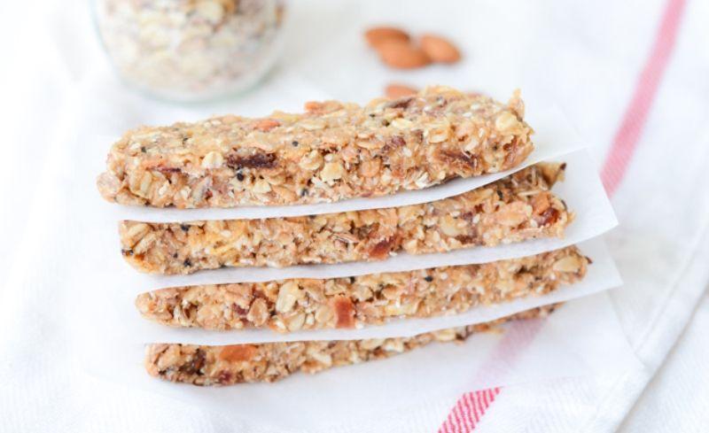 Mod de Preparare: Tocați migdalele. Într-un bol, amestecați toate ingredientele. Puneți amestecul în formele pentru batoane de granola (sau pe fundul unei tăvi de copt tapetată cu hârtie de copt).