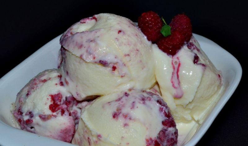 Se toarnă jumătate din înghețată în formă și se netezește. Se adaugă coulisul de zmeură și amestecă ușor cu o lingură. Adăugați înghețata rămasă și neteziți. Acoperiți cu folie de plastic și puneți la congelator timp de 2 ore. După aceste 2 ore se lasă recipientul cu înghețată la temperatura camerei 5-10 minute, pentru a face înghețata mai moale. Scoateți folia de plastic apoi serviți înghețata folosind o lingură de înghețată. Gata! Se servește cu puțină dulceață de zmeură.