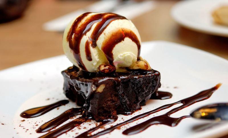Mod de Preparare: Incalziti cuptorul la 180 grade. Ungeti o tava cu unt. Intr-o tigaie topiti untul la foc mic. Adaugati zaharul si mixati pana cele 2 ingrediente se combina (1 minut), apoi luati-le de pe foc si turnati compozitia int-un castron. Adaugati cacaua, praful de copt, esenta de vanilie si sarea. Puneti ouale, amestecati incet, incorporati faina si bucatile de ciocolata. Mixati bine pana pand se va topi ciocolata si compozitia devine omogena. Turnati aluatul in tava de copt, iar deasupra aranjati zmeura. Dati la cuptor 40-45 minute sau verificati cu scobitoarea pana cand este coapta. Se taie cand s-a racit. Cand serviti puneti deasupra inghetata.