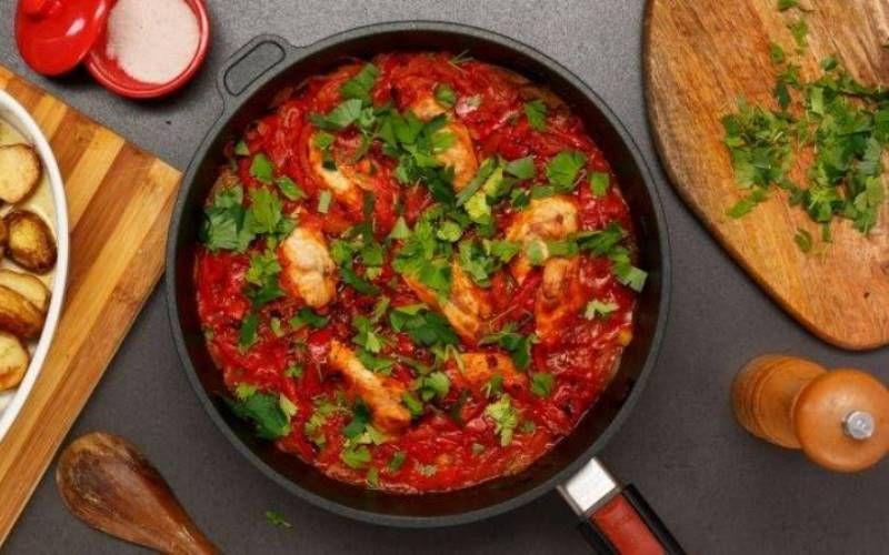 Mod de Preparare: Pulpele de pui le speli si le portionezi, asta daca nu sunt deja taiate astfel. Le stergi cu un servet de hartie, le condimentezi si le pui la prajit in uleiul incins. Dupa vreo 10 min se scot pulpele pe o farfurie iar in uleiul incins se pune faina si se amesteca pana se face ca o pasta. Acest pas - cu faina - nu este obligatoriu, are rolul de a inchega mai bine sosul. Se adauga apoi usturoiul taiat si rosiile cu tot cu sucul din conserva, plus jumatate de pahar de vin. Se pun la loc pulpele si se mai lasa sa fiarba totul pana cand carnea este bine patrunsa. Daca scade prea mult, mai poti adauga putina apa. Spre final se adauga mararul si patrunjelul tocat. Pofta buna!