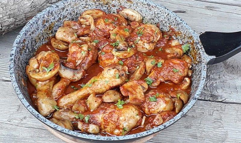 Mod de Preparare: Pulpele de pui le speli si le portionezi precum in poza, asta daca nu sunt deja taiate astfel. Le stergi cu un servet de hartie, le condimentezi si le pui la prajit in uleiul incins. Dupa vreo 10 min se scot pulpele pe o farfurie iar in uleiul incins se pune faina si se amesteca pana se face ca o pasta. Acest pas - cu faina - nu este obligatoriu, are rolul de a inchega mai bine sosul. Se adauga apoi usturoiul taiat si rosiile cu tot cu sucul din conserva, plus jumatate de pahar de vin. Se pun la loc pulpele si se mai lasa sa fiarba totul pana cand carnea este bine patrunsa. Daca scade prea mult, mai poti adauga putina apa. Spre final se adauga mararul si patrunjelul tocat. Pofta buna!