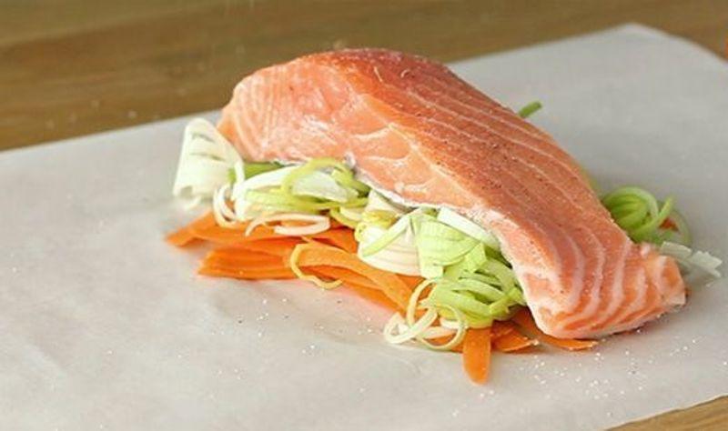 Mod de Preparare: Taie un patrat de hartie pergament. Curatati morcovii si taiati-i felii folosindu-va de un aparat de curatat coaja. Asezati feliile de morcov in centrul hartiei de pergament. Curatati prazul si taiati-l subtire. Puneti jumatate din prazul taiat peste morcovi. Puneti un fileu de somon peste legume. Puneti sare, piper si presarati putin cimbru. Indoiti foaia in doua, somonul trebuie sa fie in centru si inchideti punguta treptat prin plierea in triunghi. Inchideti prin pliere sau capsare. Folia trebuie sa fie bine sigilata. Dati la cuptor 20 minute la 180°C.