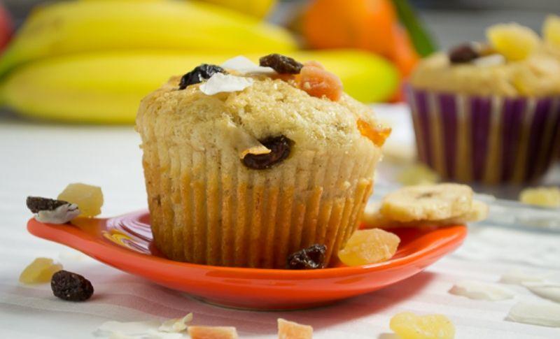 Mod de Preparare: Intr-un bol mare se cerne faina impreuna cu praful de copt (cele doua ingrediente se cern pentru a da brioselor o consistenta pufoasa). Se adauga zaharul brun si o lingurita de scortisoara. Cele doua banane se decojesc si se paseaza usor cu furculita, in asa fel incat sa ramana si bucatele mai mari. Bananele pasate se adauga in bolul cu ingrediente uscate. Intr-un alt vas se amesteca apa minerala, uleiul si esenta de vanilie, apoi se toarna peste amestecul de faina si zahar, impreuna cu fructele confiate taiate in bucati mici. Toate ingredientele se amesteca si se omogenizeaza. Compozitia se pune in foite de briose (asezate in prealabil in tava) si se baga la cuptor. Dupa aproximativ 25 de minute, briosele devin rumene si se pot scoate din cuptor. Se presara zahar brun si putina scortisoara deasupra brioselor, apoi sunt gata de servit.
