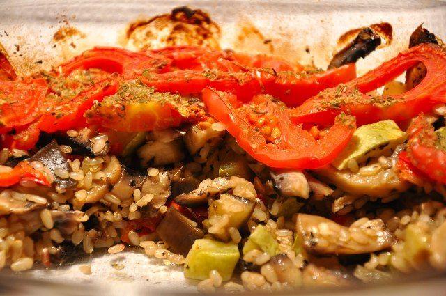 Mod de preparare: In primul rand, am taiat cartofii in bucati mai mari, pe care le-am asezat intr-o tava. Deasupra am adaugat dovlecelul, vanata, ardeiul gras, morcovul si ceapa, toate taiate rondele mari. Usturoiul l-am zdrobit cu latura cutitului pe tocator, dupa care l-am taiat felii subtiri si l-am presarat printre legume. Am adaugat si orezul printre legume. Modul de aranjare in tava depinde de imaginatia fiecaruia. Peste toate legumele am pus sare, piper, boia de ardei dulce si putin ulei. Apoi am adaugat apa pana la nivelul legumelor (aproximativ 2-3 cani), si am dat totul la cuptorul incins. Intre timp, am taiat ceafa de porc in fasii, am condimentat-o cu sare, piper, cimbru si boia de ardei dulce si am rumenit-o in tigaie, dupa care am scos-o pe o farfurie. Dupa ce legumele au stat 25 de minute la cuptor la foc mediu, am adaugat carnea, iar deasupra am turnat rosiile in bulion. Am mai tinut la cuptor inca 5 minute, dupa care am scos tava si am presarat patrunjelul tocat.