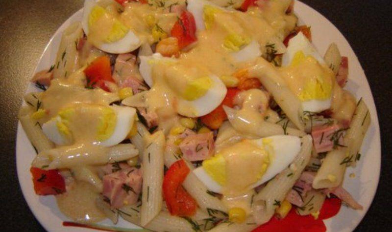 Mod de Preparare: Se fierb pastele si se lasa la scurs. Se amesteca apoi intr-un bol cu porumbul, ardeiul si salamul victoria taiat cubulete, mararul tocat si sare. Ouale se fierb si se taie in patru. Se pun peste salata din farfurie si se toarna peste ele maoineza. Cand sa fac maioneza descoperit ca nu mai mustar asa ca inventat o maioneza dintr-un galbenus, sos de hrean din comert si ulei. amestecat maioneza astfel obtinuta cu iaurt si pasta iute de ardei.