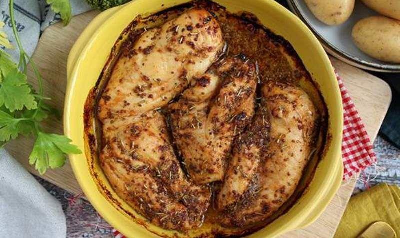 Mod de Preparare: Amestecati uleiul de masline, mierea, mustarul, otetul, boiaua dulce, rozmarinul, sarea si piperul. Adaugati pieptii de pui si amestecati bine. Transferati totul intr-un vas de copt, acoperiti cu folie alimentara si puneti la frigider timp de 15 - 30 de minute (optional: marinarea puiului ii va da mai multa aroma). Indepartati folia si introduceti la cuptor 25 de minute la 200° C.