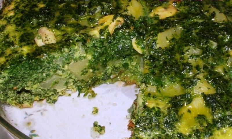 Cand este aproape gata, se adauga ciupercile si se mai calesc cateva minute. Intre timp cartofii se curata de coaja, se taie bucatele mici si se amesteca cu ceapa si ciupercile. Intr-o tigaie calim usturoiul si adaugam spanacul pe care il calim cateva minute. Batem oulalele spuma si le adugam peste spanac. Amestecam usor spanacul cu cartofii. Condimentam cu sare si piper. Punem totul intr-o tava unsa cu unt (ulei) si dam la cuptor pentru 30-40 minute. Servim fierbinte.