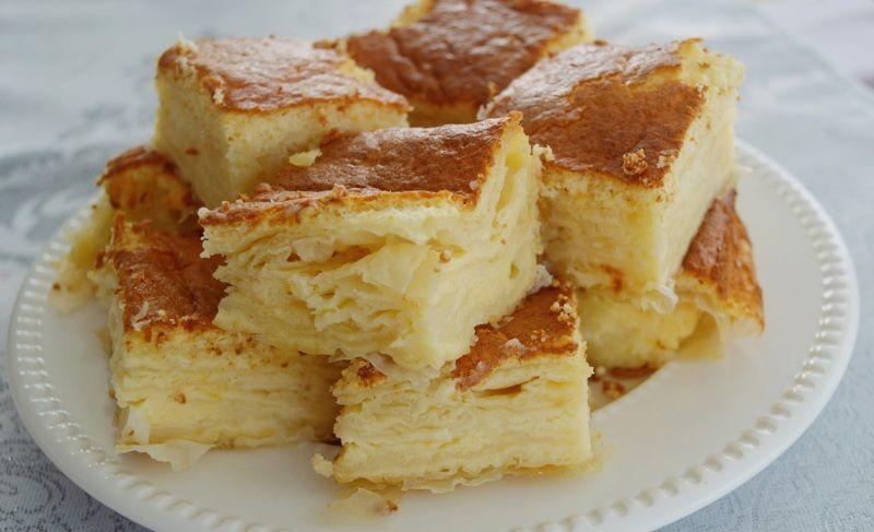 Mod de preparare: Compoziția pentru delicioasa plăcintă se prepară foarte simplu și rapid. De aceea este indicat ca mai întâi să aduni pe masa de lucru toate ingredientele, dar și ustensilele cu care lucrezi. Apoi, pregătești o tavă de cuptor cu dimensiunile aproximative de 26/37 cm. Unge interiorul tăvii cu unt, din belșug. Înainte de a începe amestecarea ingredientelor pentru plăcintă, pornește cuptorul la 180 de grade Celsius. Sparge ouăle într-un bol și adaugă peste ele sarea și zahărul. Dacă optezi pentru a prepara plăcinta sărată, exclude zahărul. Dacă dorești ca plăcinta să fie aromată, adaugă zahăr pudră cu aromă de vanilie. Amestecă ouăle cu sarea și zahărul timp de 2-3 minute, până când obții o compoziție spumoasă. Dizolvă bicarbonatul de sodiu în iaurt și adaugă amestecul rezultat peste compoziția de ouă. Omogenizează imediat pentru că bicarbonatul va produce bule de aer în iaurt în timp ce se dizolvă. Dacă folosești chefir sau lapte, dizolvă bicarbonatul în puțin suc de lămâie. Adaugă și brânza proaspătă și din nou omogenizează bine compoziția. La final, încorporează treptat făina, folosind o spatulă. Întinde compoziția obținută în tava pregătită și nivelează-i uniform suprafața. Pune tava în cuptor și coace delicioasa plăcintă dobrogeană cu iaurt pentru 40 de minute, la 180 de grade Celsius. Se va rumeni frumos la suprafață, iar interiorul va rămâne cremos. Lasă plăcinta să se răcească bine înainte de a o porționa. Este foarte gustoasă, mai ales servită rece, de la frigider, alături de un pahar cu lapte sau cu iaurt.