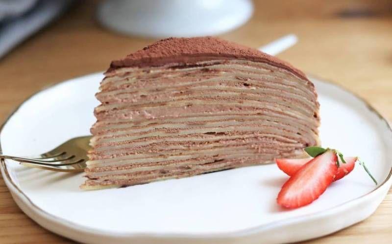 Pregătiți crema tiramisu: Bateți mascarpone cu frișca lichidă foarte rece, zahărul pudră și cafeaua măcinată până obțineți un amestec ferm. Așezați toate clătitele pe o farfurie, așezați inelul deasupra și decupați marginile clătitelor astfel încât să fie toate de aceeași dimensiune. Puneți cercul pe platoul de servire. Puneți două clătite una peste alta, în cerc. Întindeți o lingură de smântână pe toată suprafața clătitei. Presarați cu pudră de cacao. Apoi puneți iar o clătită, întindeți deasupra crema tiramisu și pudrați cacao. Repetați operațiunea până la ultima clătită. Pe ultima clătită se întinde frișcă apoi se acoperă cu folie alimentară și se dă la frigider pentru 1 oră. Pudrați deasupra și părțile laterale ale tortului cu pudră de cacao.